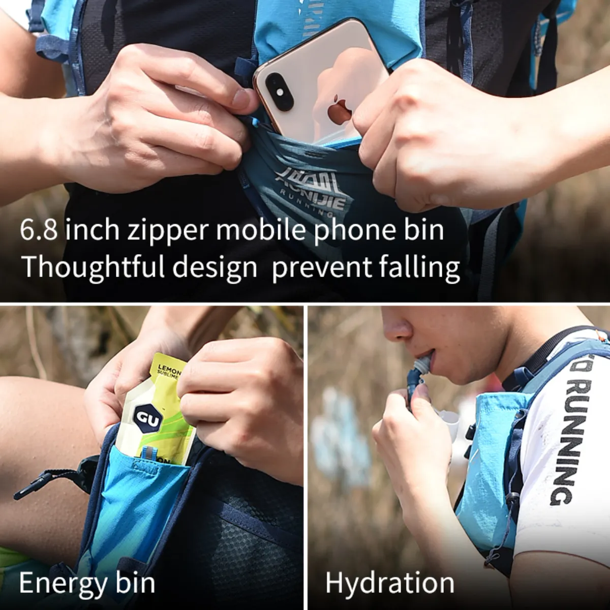 • Bolsillos delanteros para soft flasks (no incluidos), geles, barritas y celulares de hasta 6.8”.