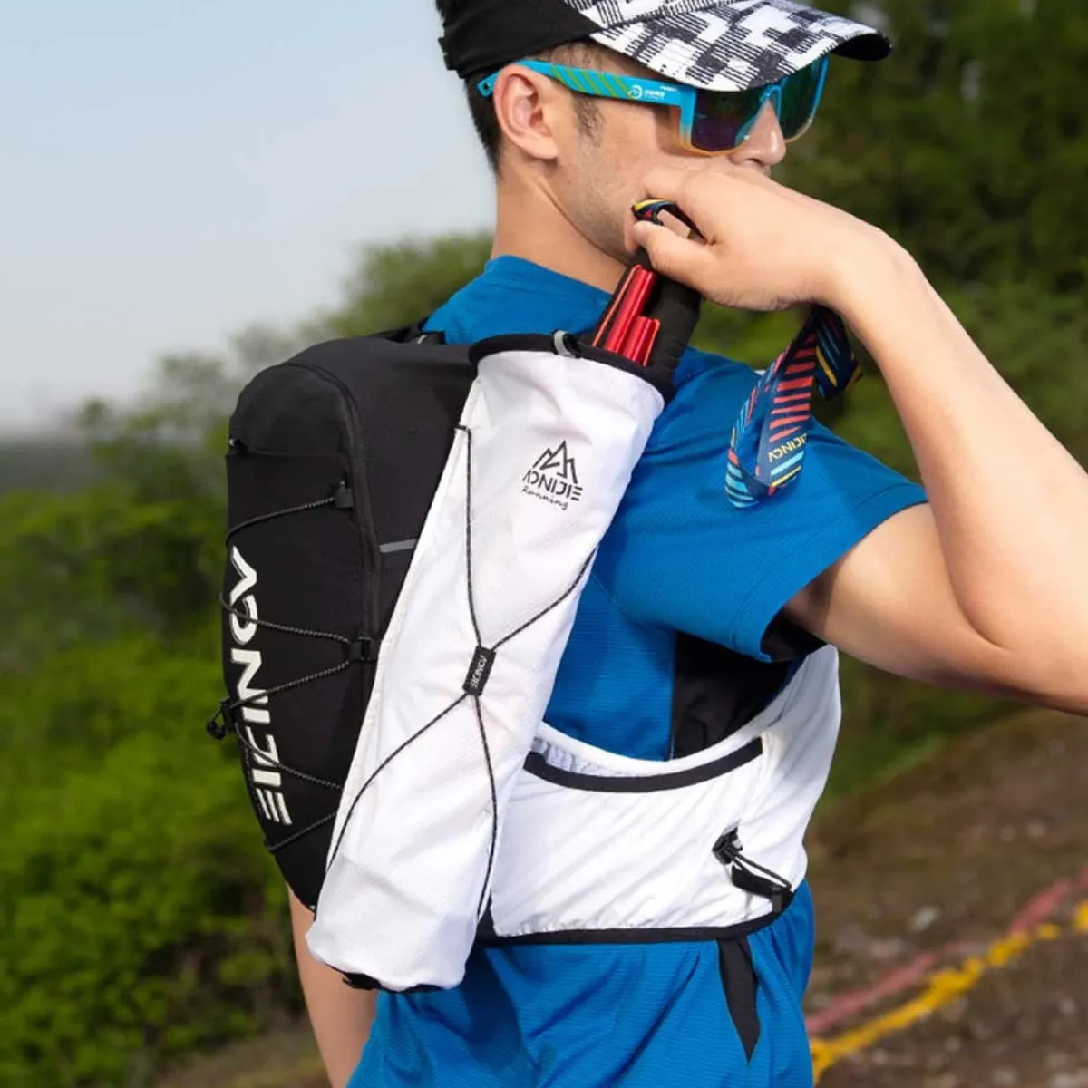 • Sistema para transportar bastones en los laterales y compatible con bolsa porta bastones de Aonijie (no incluida).