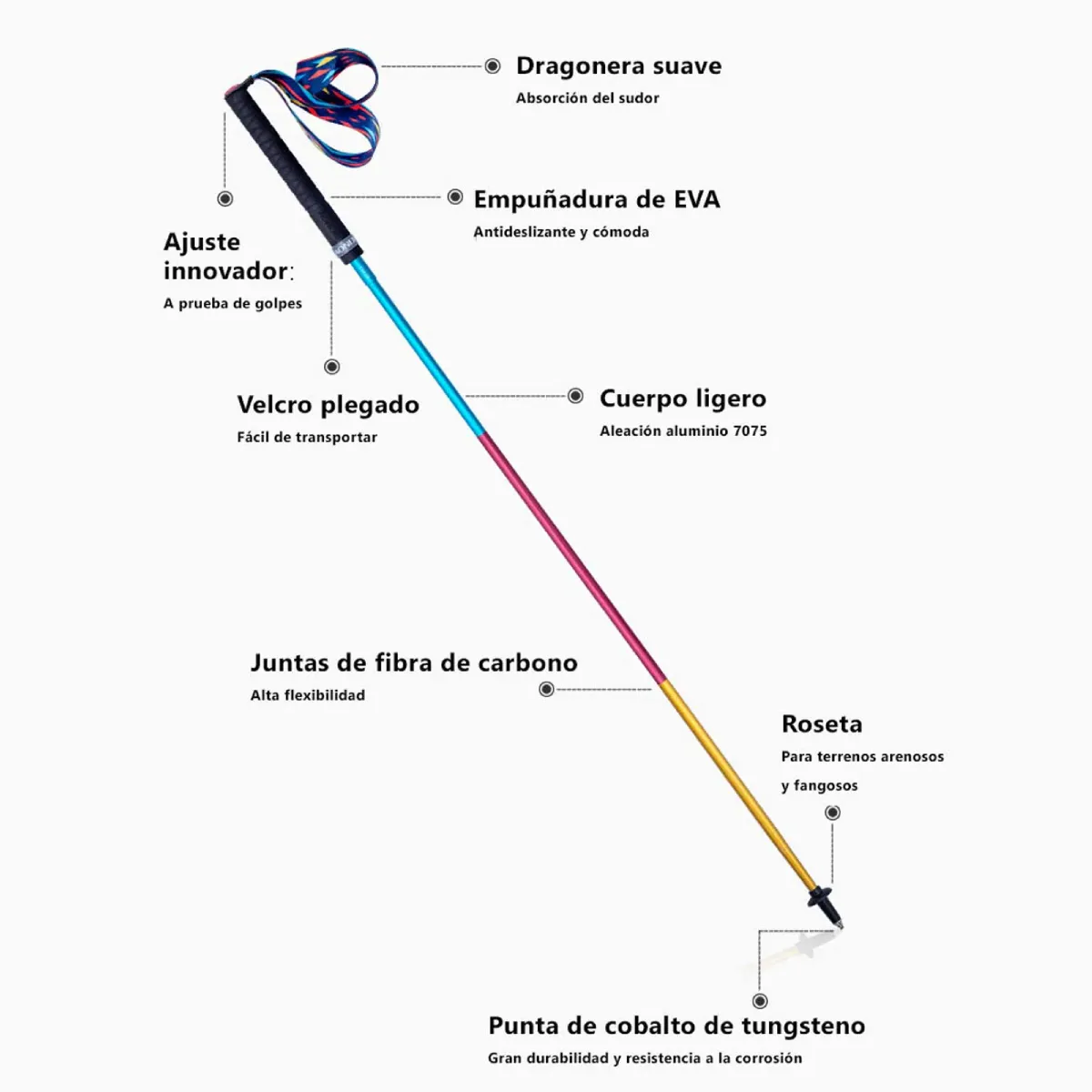 Diseñado con aleación de aluminio ultraliviano 7075, este bastón plegable en tres tramos ofrece una relación peso/resistencia excepcional. Su sistema de montaje rápido y su diseño compacto lo hacen ideal para trail running y trekking. Incluye roseta desmontable para arena / barro y empuñadura de espuma EVA para mayor comodidad y funcionalidad.